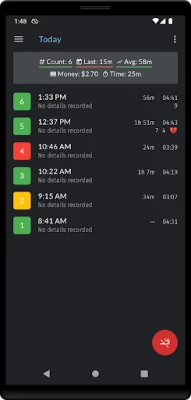 ★ Provides a summary for the day that tracks the number of cigarettes, time from last smoke, average time between cigarettes, money and time spent