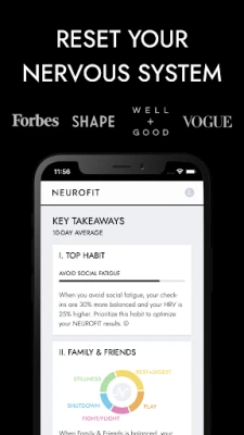 NEUROFIT™ is the world’s first Nervous System Trainer, helping you regulate, balance, and optimize your mind and body with daily check-ins, biometric measurements, tailored somatic exercises, and personalized insights. If you’ve explored health apps like Calm, Headspace, Breathwrk, Rootd, BetterHelp or TalkSpace for mental health, therapy, or anxiety relief, discover a new high-performance path to calm, deep sleep, and relaxation with NEUROFIT.